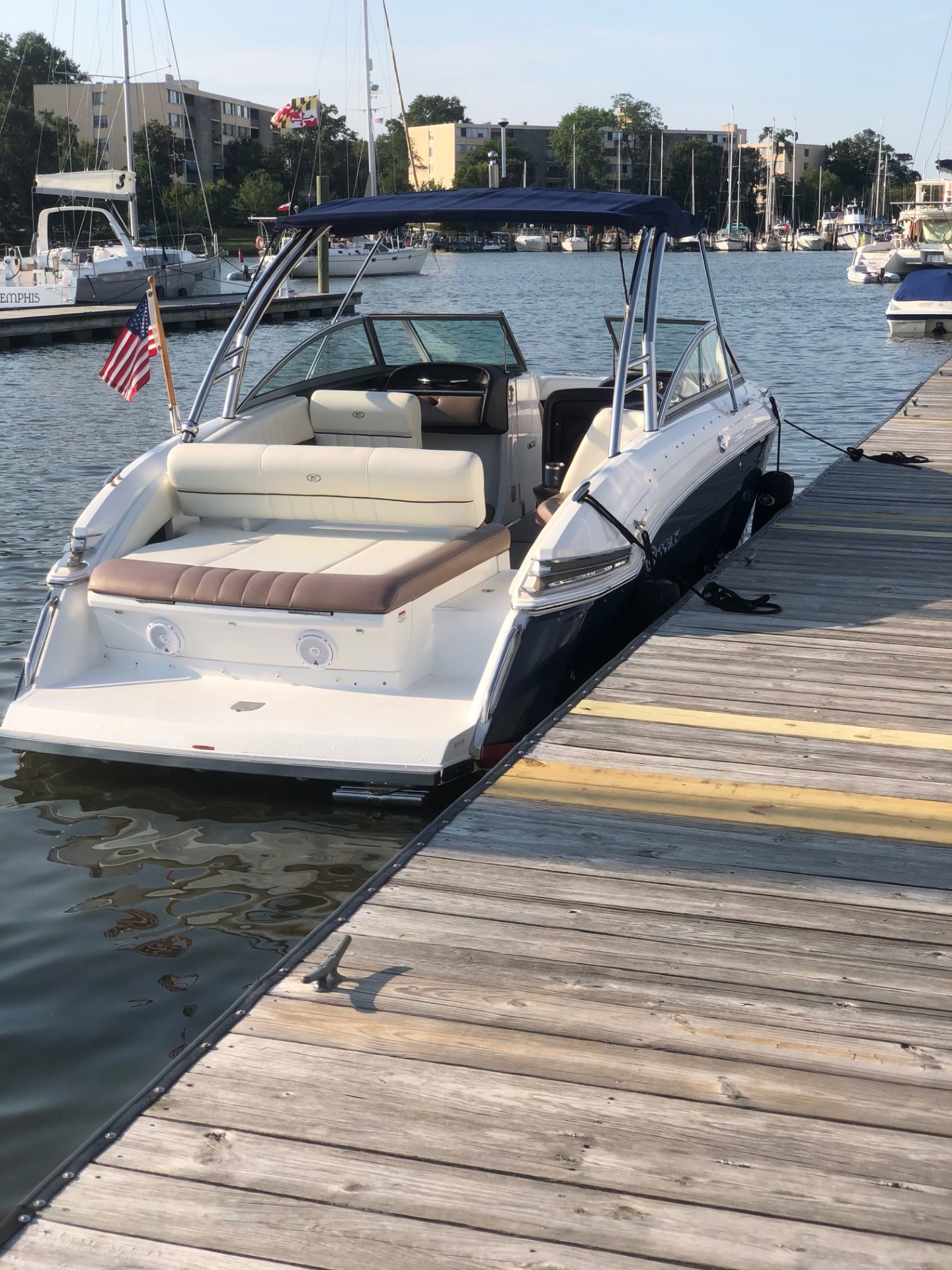 With just 558 hours on the powerful Volvo Penta 380 HP V8, this boat has been meticulously serviced and boatel kept — no bottom paint and protected with a full boat cover.