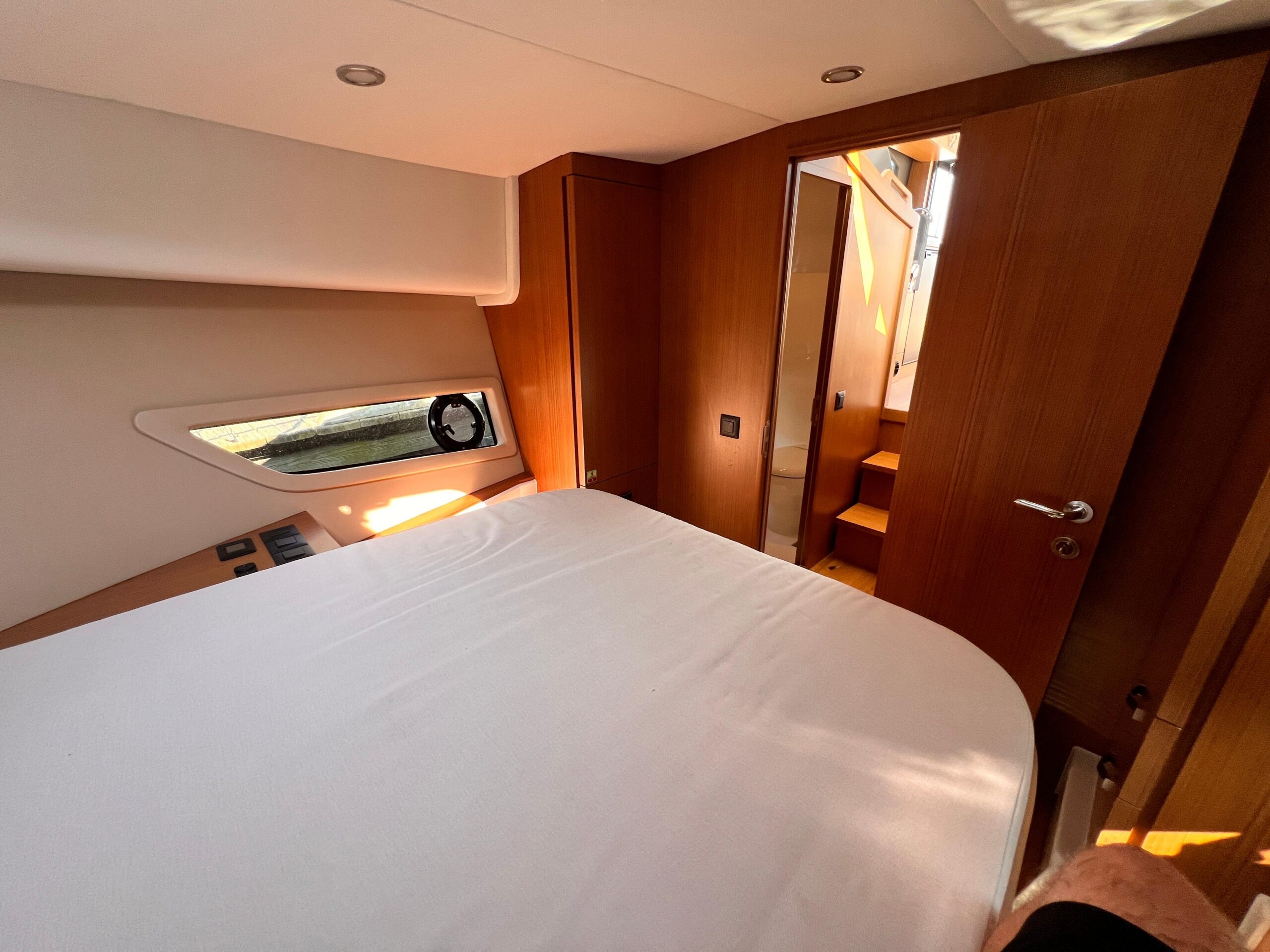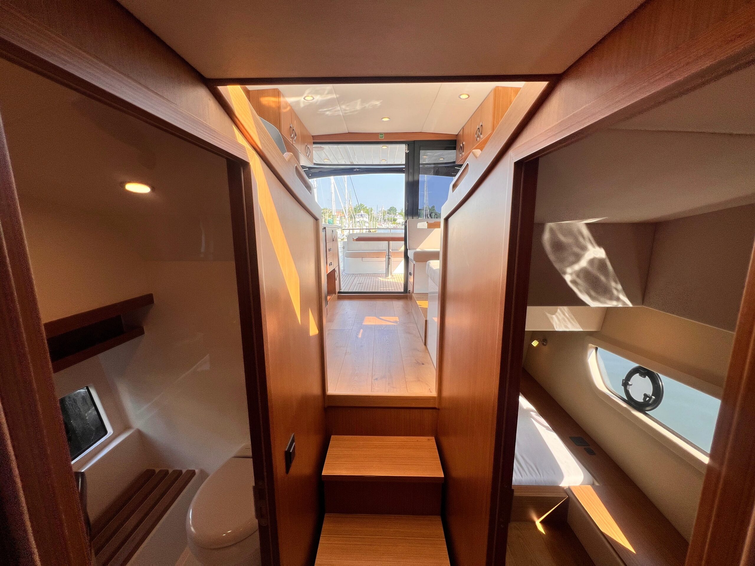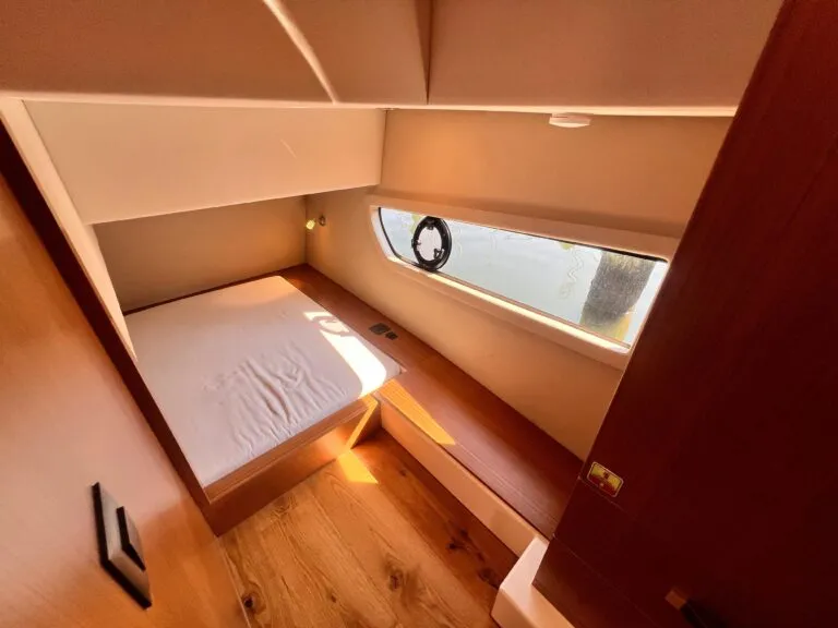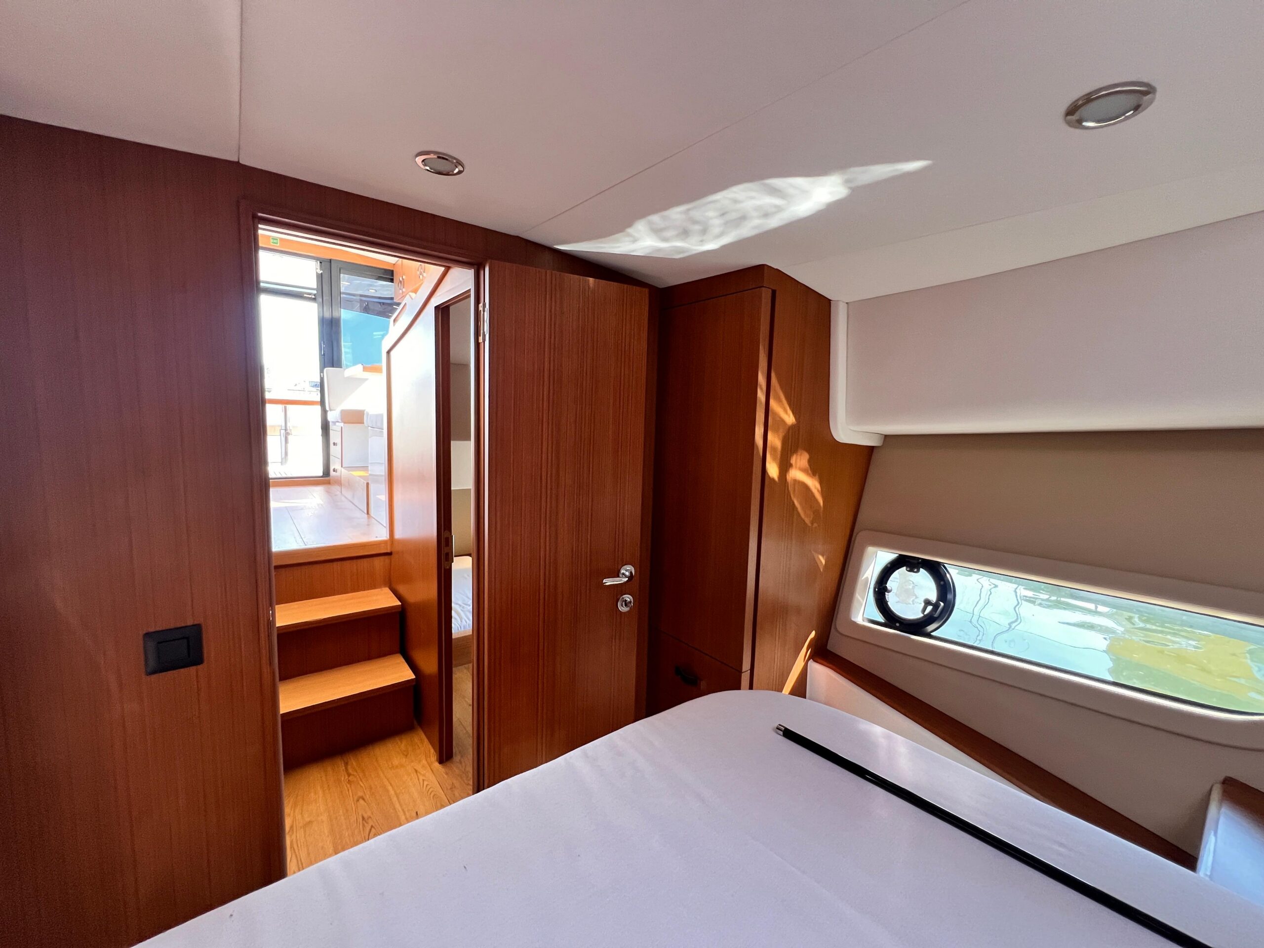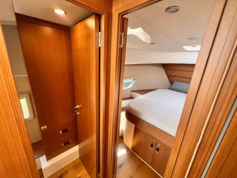 Forward Owner’s Cabin: Island berth, overhead hatch, ample storage