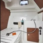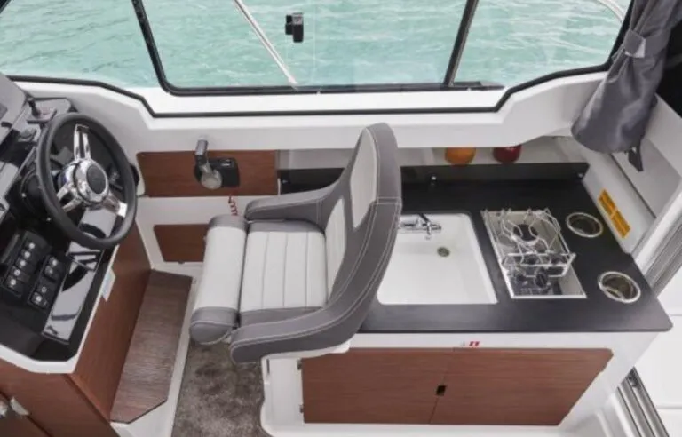 The starboard-side galley offers multiple configurations for cooking and storage. Forward of the helm, there is a closed head with a shower compartment and a V-berth for two. Strong cabin airflow is achieved through two strategically placed vents above the windshield, keeping the interior comfortable even at higher speeds.