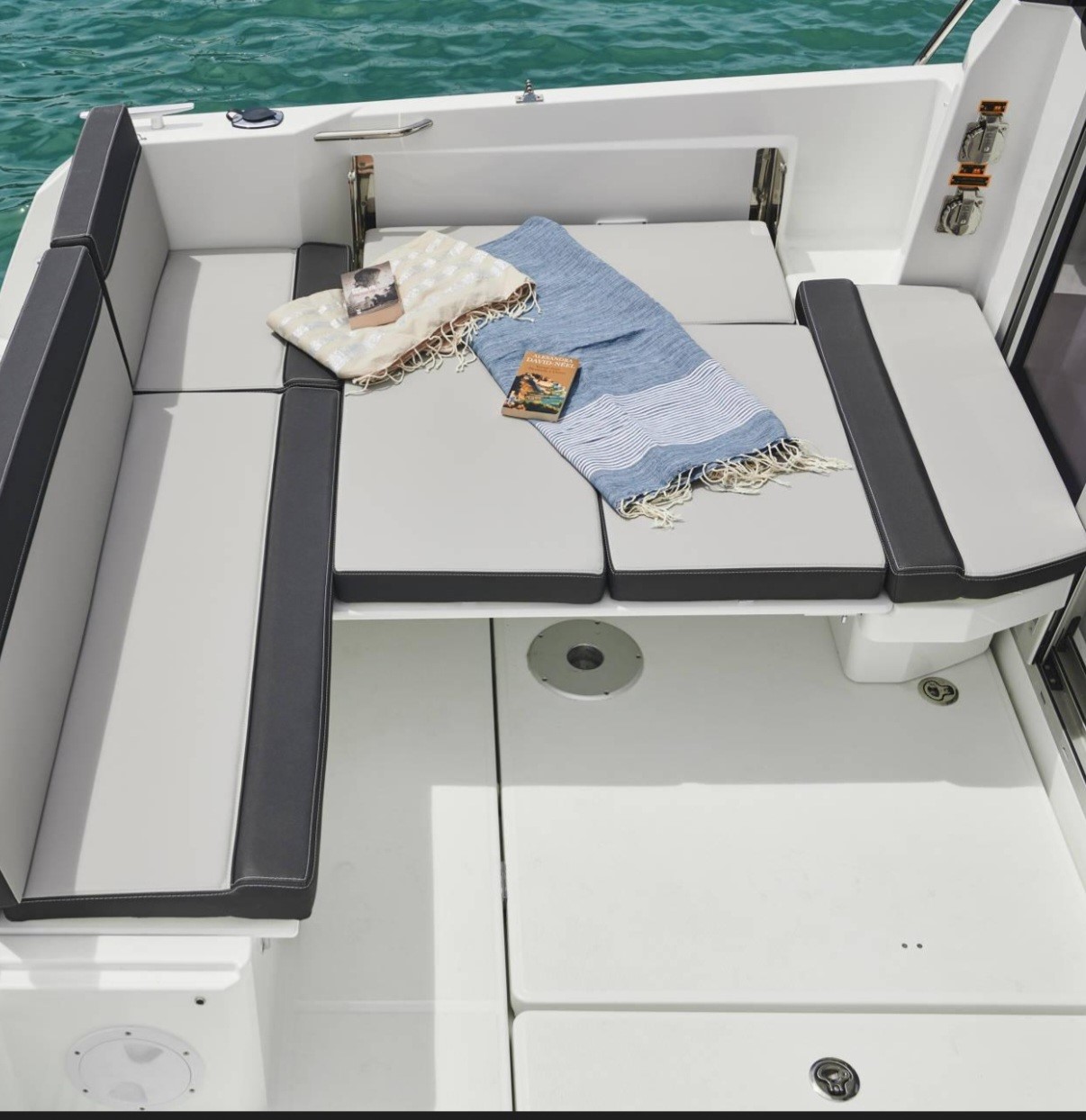 Powered by a 250 HP outboard, the NC 795 S2 delivers responsive handling and a smooth ride. True to Jeanneau’s design, the engine can be completely lifted out of the water without sacrificing cockpit seating space. Access is easy via the oversized swim platforms or the starboard-side boarding gate.