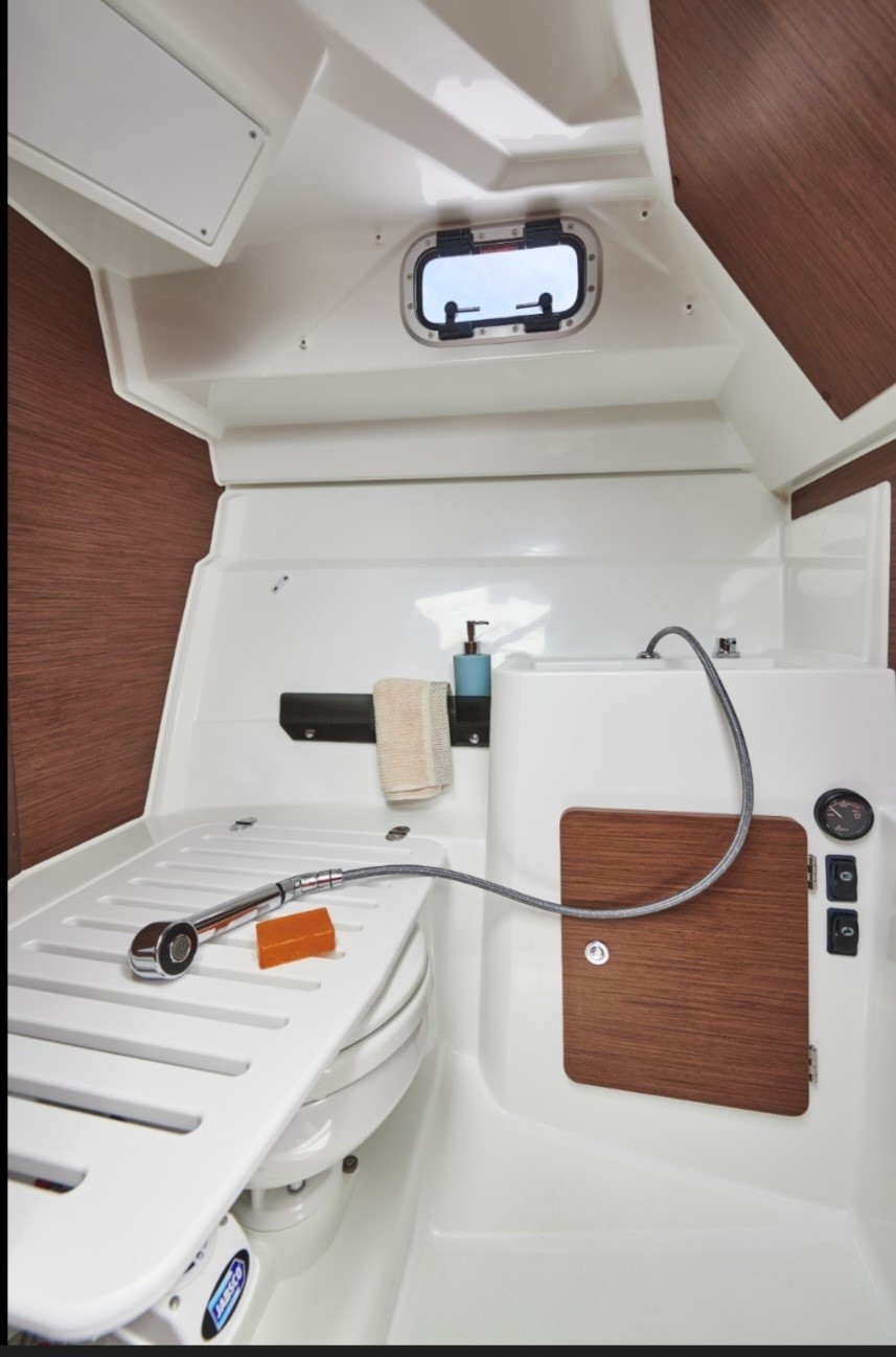 The starboard-side galley offers multiple configurations for cooking and storage. Forward of the helm, there is a closed head with a shower compartment and a V-berth for two. Strong cabin airflow is achieved through two strategically placed vents above the windshield, keeping the interior comfortable even at higher speeds.