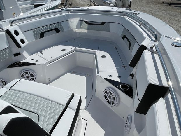 The thoughtful deck layout ensures ample storage, versatile seating, and easy movement around the boat.