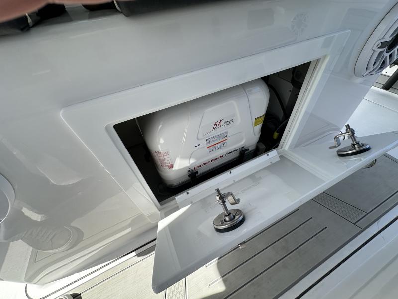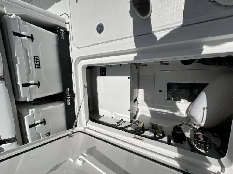 • Generous storage compartments are available throughout the boat, including lockable rod storage and space for fishing gear, coolers, and personal items.
