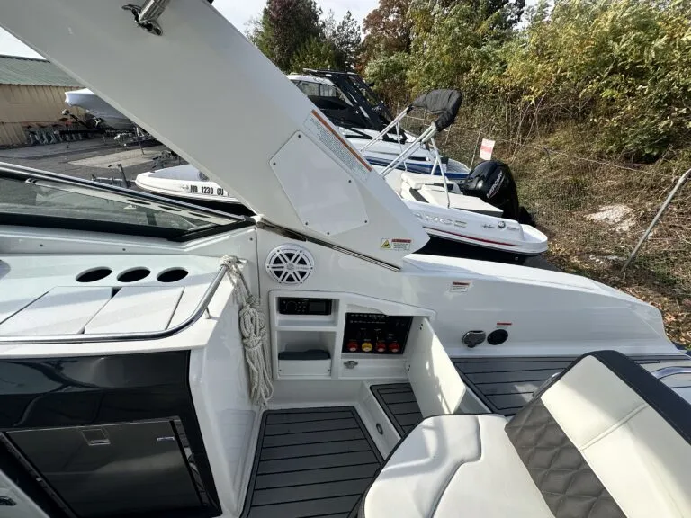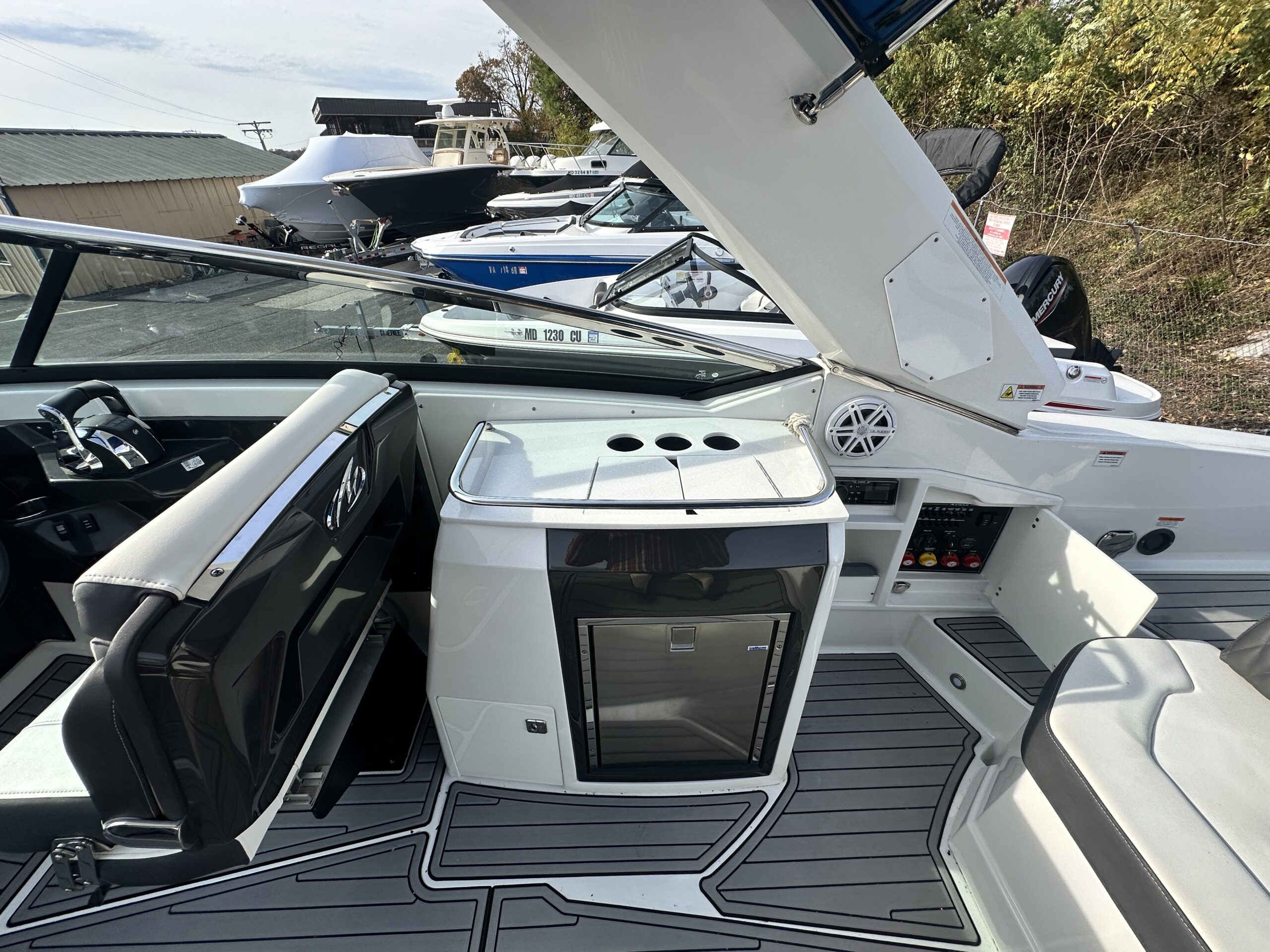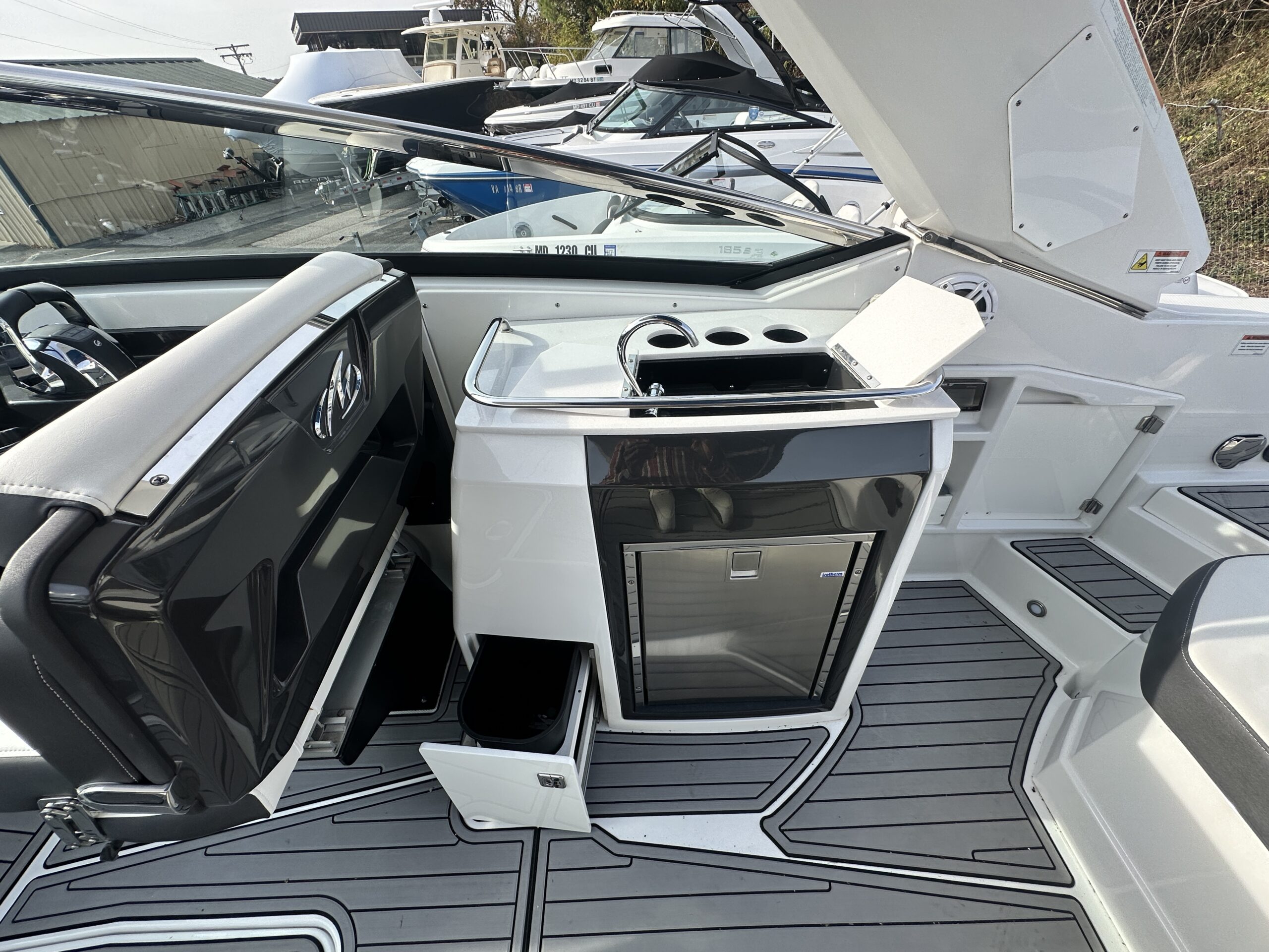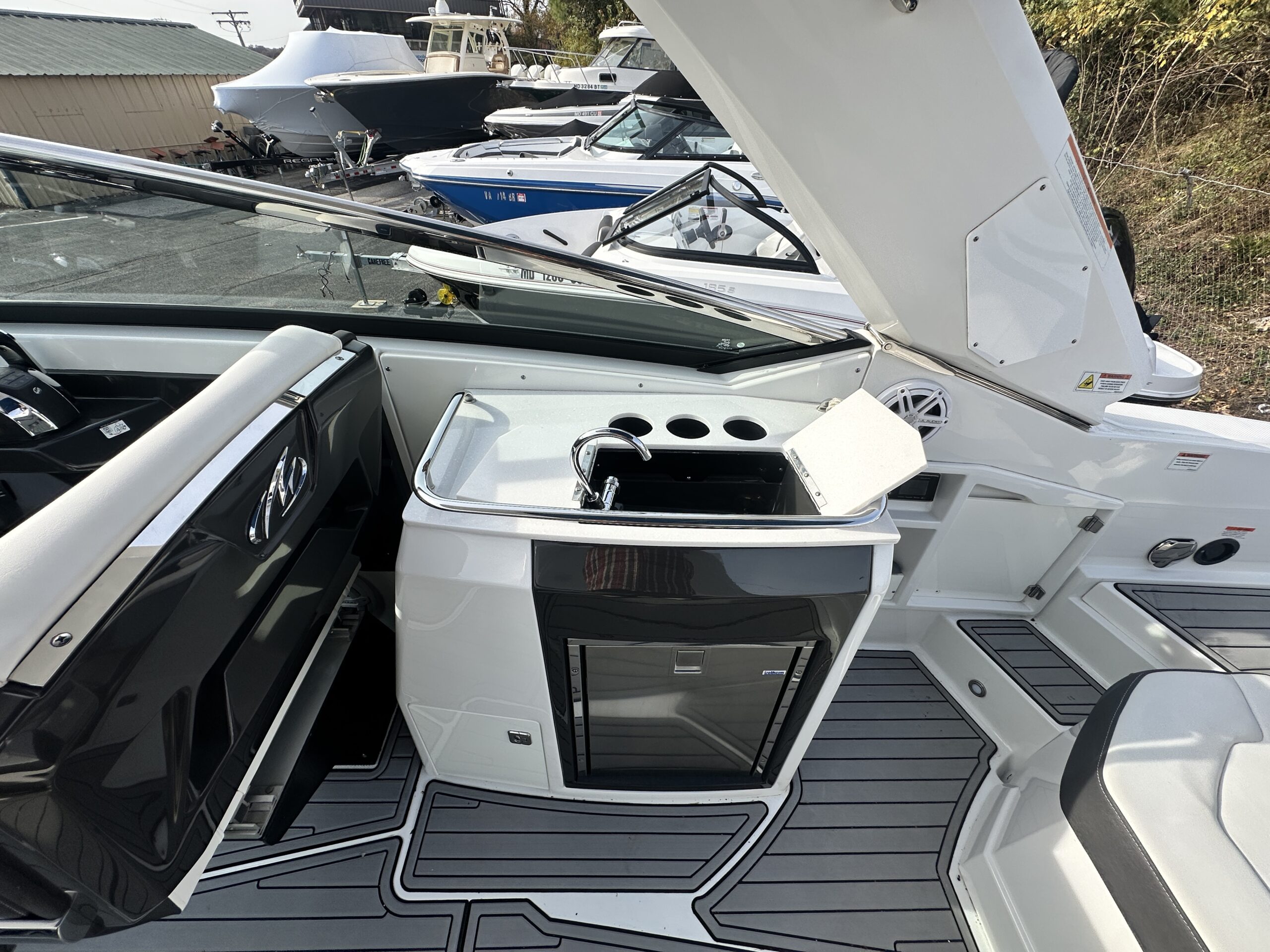 The 2019 Monterey 305SS Super Sport features a wet bar with sink and built-in refrigerator.