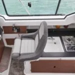 The starboard-side galley offers multiple configurations for cooking and storage. Forward of the helm, there is a closed head with a shower compartment and a V-berth for two. Strong cabin airflow is achieved through two strategically placed vents above the windshield, keeping the interior comfortable even at higher speeds.