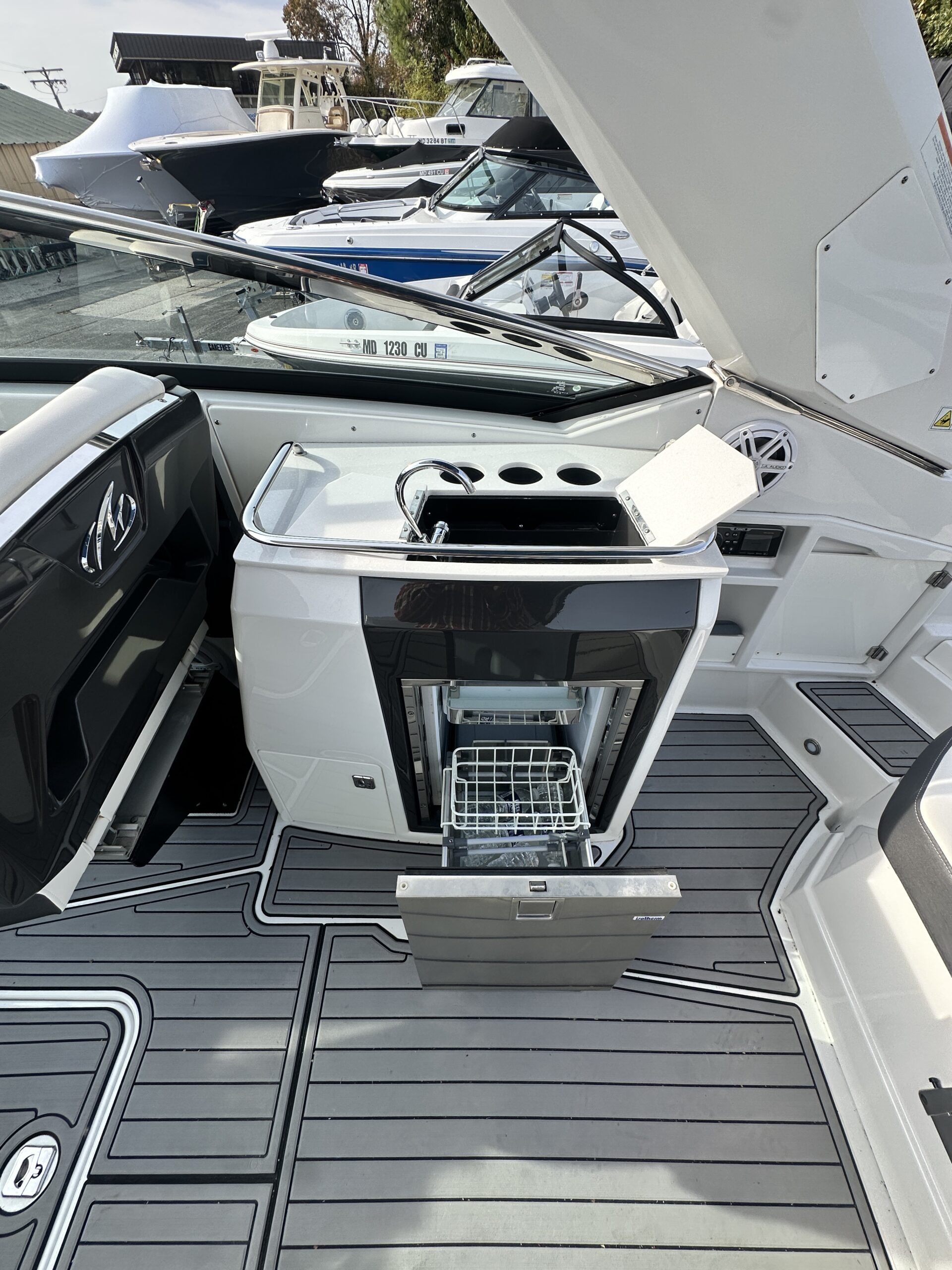 The 2019 Monterey 305SS Super Sport features a wet bar with sink and built-in refrigerator.